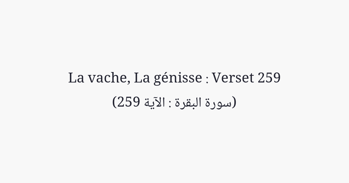 Ou comme celui qui passait par un village désert et dévasté: «Comment Allah va-t-Il redonner la vie à celui-ci après sa mort?» dit-il. Allah donc le fit mourir et le garda ainsi pendant cent ans. Puis Il le ressuscita en disant: «Combien de temps as-tu demeuré ainsi?» «Je suis resté un jour, dit l'autre, ou une partie d'une journée.» «Non! dit Allah, tu es resté cent ans. Regarde donc ta nourriture et ta boisson: rien ne s'est gâté; mais regarde ton âne... Et pour faire de toi un signe pour les gens, et regarde ces ossements, comment Nous les assemblons et les revêtons de chair». Et devant l'évidence, il dit: «Je sais qu'Allah est Omnipotent».