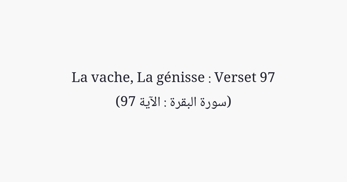 Dis: «Quiconque est ennemi de Gabriel doit connaître que c'est lui qui, avec la permission d'Allah, a fait descendre sur ton cœur cette révélation qui déclare véridiques les messages antérieurs et qui sert aux croyants de guide et d'heureuse annonce»