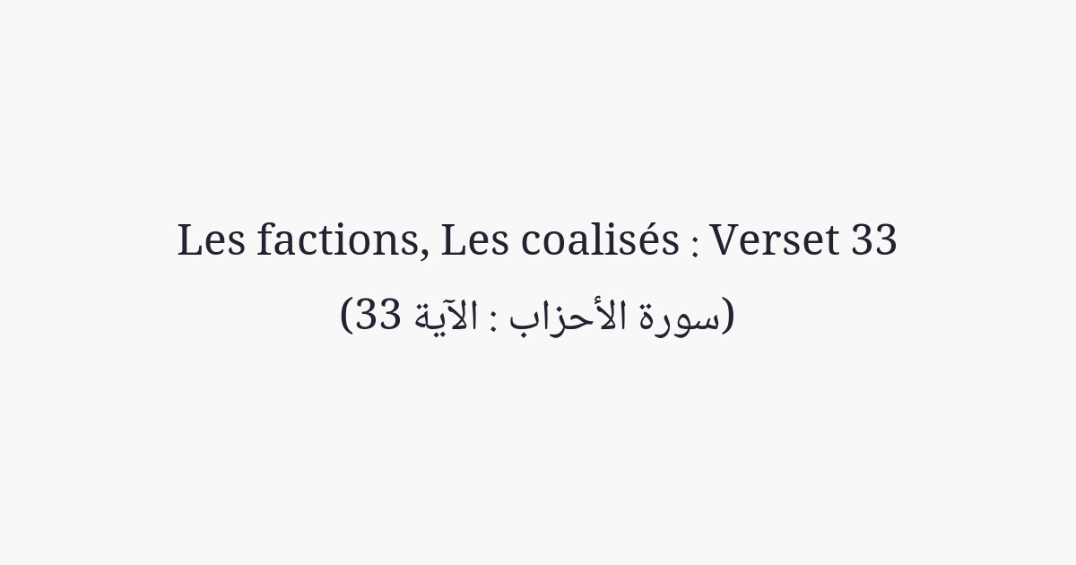 Restez dans vos foyers; et ne vous exhibez pas à la manière des femmes d'avant l'Islam (Jâhiliyah). Accomplissez la Salât, acquittez la Zakât et obéissez à Allah et à Son messager. Allah ne veut que vous débarrasser de toute souillure, ô gens de la maison [du prophète], et veut vous purifier pleinement.