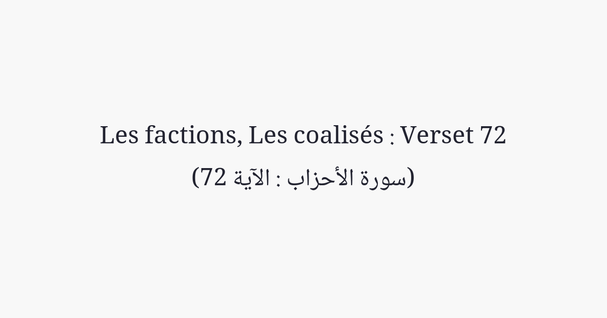 Nous avions proposé aux cieux, à la terre et aux montagnes la responsabilité (de porter les charges de faire le bien et d'éviter le mal). Ils ont refusé de la porter et en ont eu peur, alors que l'homme s'en est chargé; car il est très injuste [envers lui-même] et très ignorant.