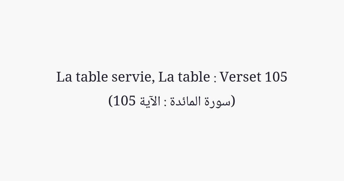 O les croyants! Vous êtes responsables de vous-mêmes! Celui qui s'égare ne vous nuira point si vous vous avez pris la bonne voie. C'est Vers Allah que vous retournerez tous; alors Il vous informera de ce que vous faisiez.