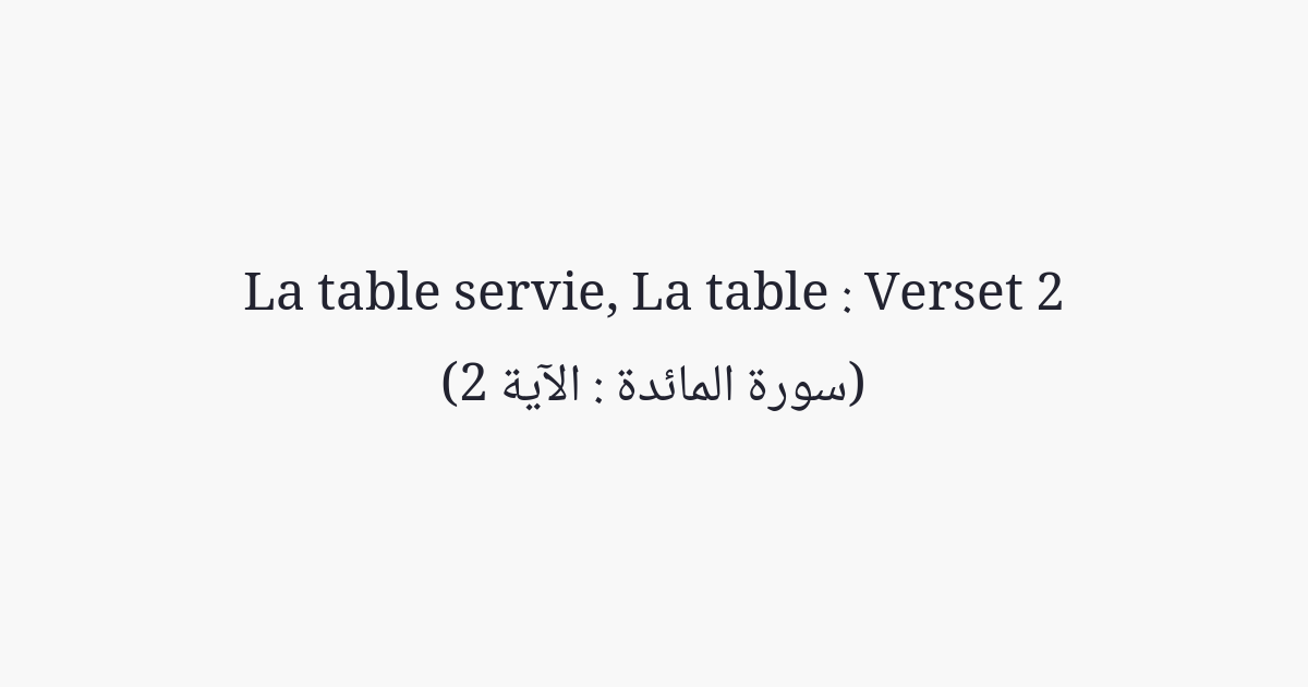 O les croyants! Ne profanez ni les rites du pèlerinage (dans les endroits sacrés) d'Allah, ni le mois sacré, ni les animaux de sacrifice, ni les guirlandes, ni ceux qui se dirigent vers la Maison sacrée cherchant de leur Seigneur grâce et agrément. Une fois désacralisés, vous êtes libres de chasser. Et ne laissez pas la haine pour un peuple qui vous a obstrué la route vers la Mosquée sacrée vous inciter à transgresser. Entraidez-vous dans l'accomplissement des bonnes œuvres et de la piété et ne vous entraidez pas dans le péché et la transgression. Et craignez Allah, car Allah est, certes, dur en punition!