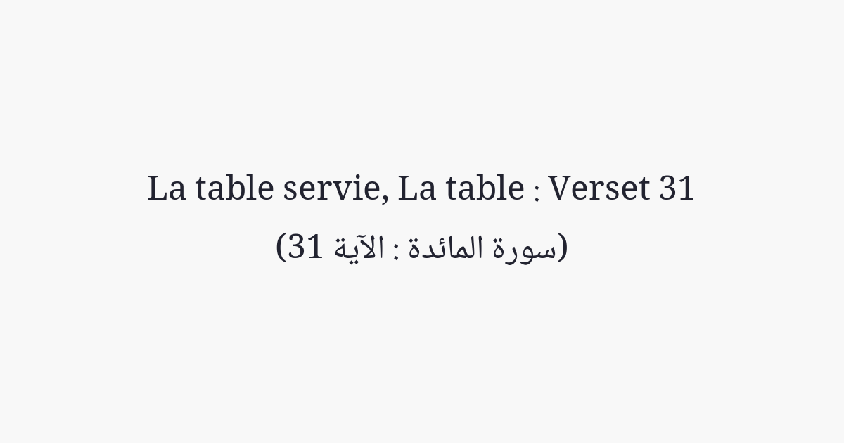 Puis Allah envoya un corbeau qui se mit à gratter la terre pour lui montrer comment ensevelir le cadavre de son frère. Il dit: «Malheur à moi! Suis-je incapable d'être, comme ce corbeau, à même d'ensevelir le cadavre de mon frère?» Il devint alors du nombre de ceux que ronge le remords.