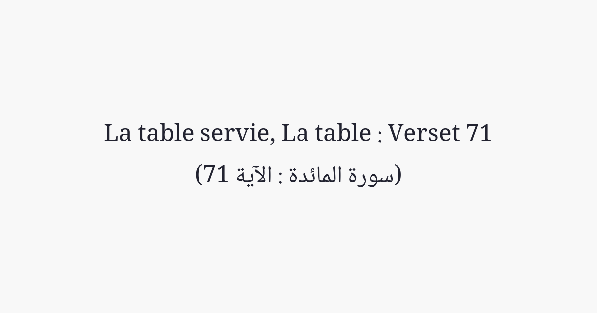 Comptant qu'il n'y aurait pas de tentation contre eux, ils étaient devenus aveugles et sourds. Puis Allah accueillit leur repentir. Ensuite, beaucoup d'entre eux redevinrent aveugles et sourds. Et Allah voit parfaitement ce qu'ils font.