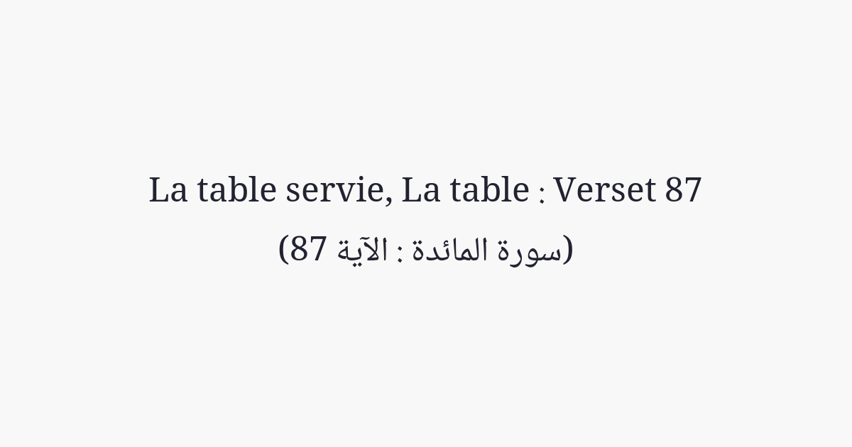 O les croyants: ne déclarez pas illicites les bonnes choses qu'Allah vous a rendues licites. Et ne transgressez pas. Allah, (en vérité,) n'aime pas les transgresseurs.