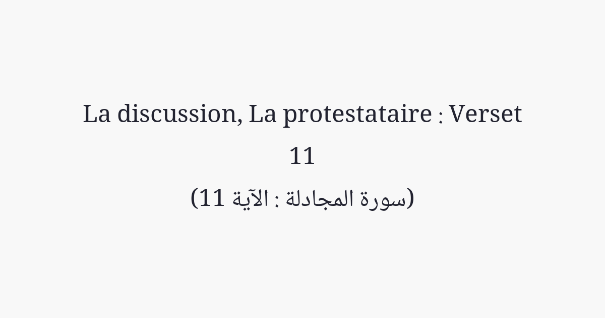 O vous qui avez cru! Quand on vous dit: «Faites place [aux autres] dans les assemblées», alors faites place. Allah vous ménagera une place (au Paradis). Et quand on vous dit de vous lever, levez-vous. Allah élèvera en degrés ceux d'entre vous qui auront cru et ceux qui auront reçu le savoir. Allah est Parfaitement Connaisseur de ce que vous faites.