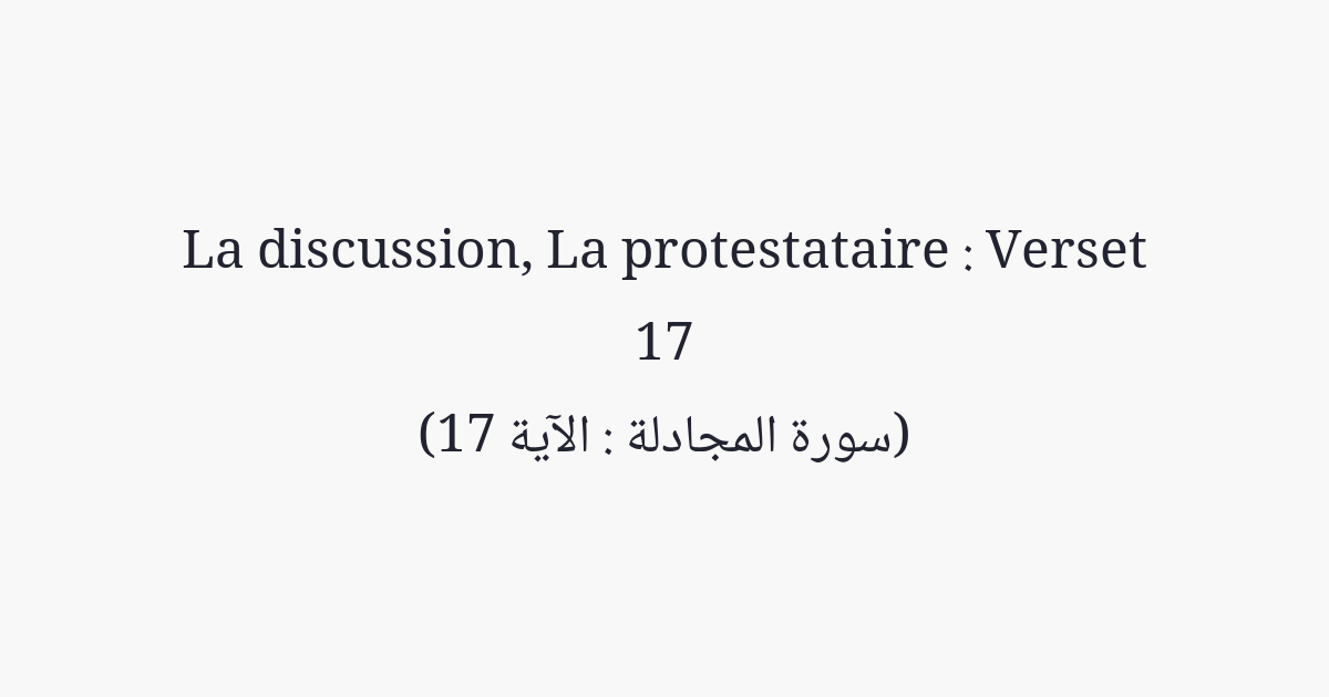 Ni leurs biens, ni leurs enfants ne leur seront d'aucune utilité contre la [punition] d'Allah. Ce sont les gens du Feu où ils demeureront éternellement.