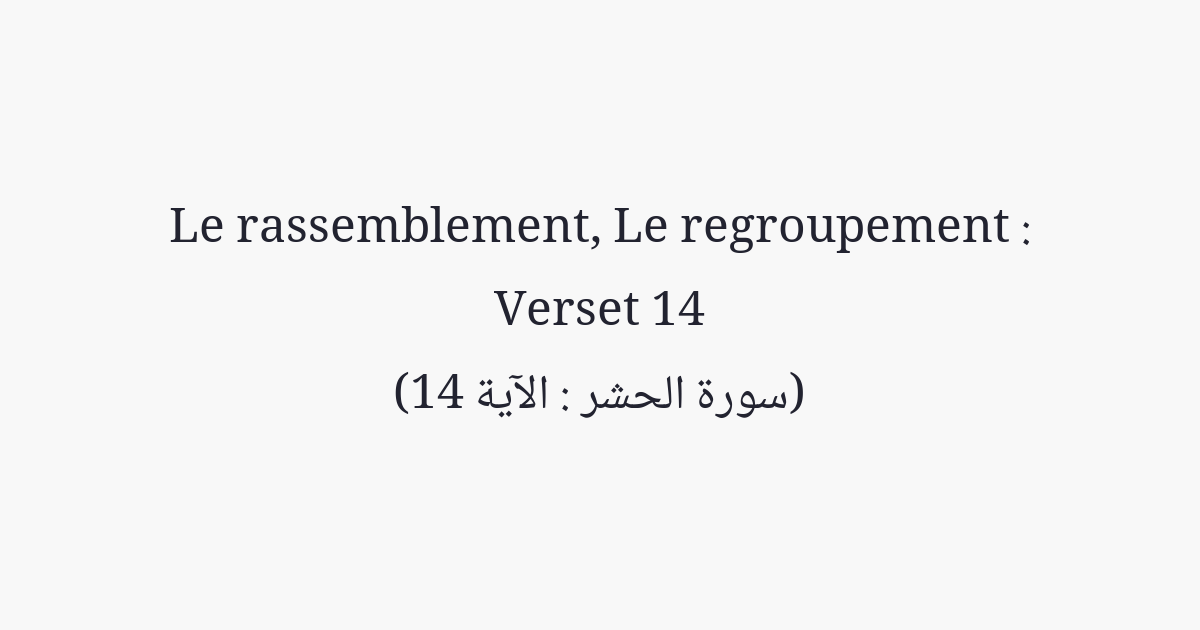 Tous ne vous combattront que retranchés dans des cités fortifiées ou de derrière des murailles. Leurs dissensions internes sont extrêmes. Tu les croirait unis, alors que leurs cœurs sont divisés. C'est qu'ils sont des gens qui ne raisonnent pas.