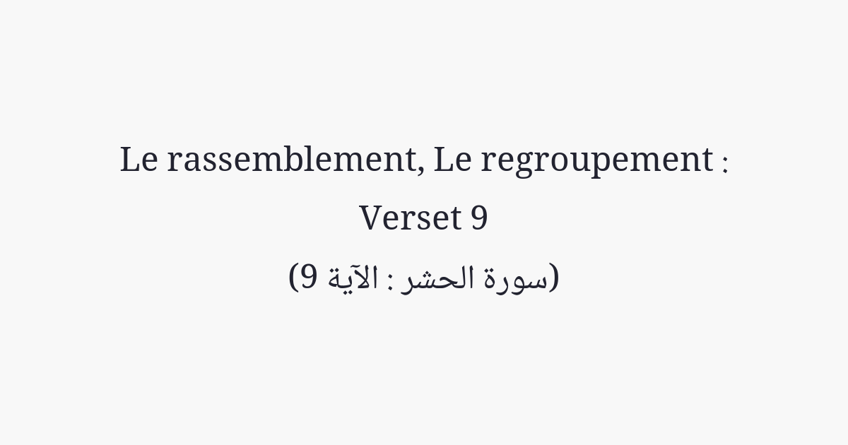 Il [appartient également] à ceux qui, avant eux, se sont installés dans le pays et dans la foi, qui aiment ceux qui émigrent vers eux, et ne ressentent dans leurs cœurs aucune envie pour ce que [ces immigrés] ont reçu, et qui [les] préfèrent à eux-mêmes, même s'il y a pénurie chez eux. Quiconque se prémunit contre sa propre avarice, ceux-là sont ceux qui réussissent.