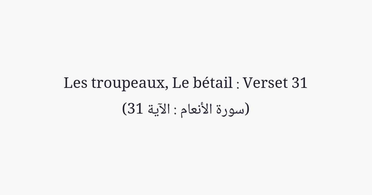 Sont perdants certes ceux qui traitent de mensonge la rencontre d'Allah. Et quand soudain l'Heure leur viendra, ils diront: «Malheur à nous pour notre négligence à son égard, Et ils porteront leurs fardeaux sur leurs dos, et quels mauvais fardeaux!