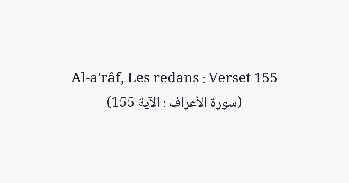 Et Moïse choisit de son peuple soixante-dix hommes pour un rendez-vous avec Nous. Puis lorsqu'ils furent saisis par le tremblement (de terre), il dit: «Mon Seigneur, si Tu avais voulu, Tu les aurais détruits avant, et moi avec. Vas-Tu nous détruire pour ce que des sots d'entre nous ont fait? Ce n'est là qu'une épreuve de Toi, par laquelle Tu égares qui Tu veux, et guides qui Tu veux. Tu es notre Maître. Pardonne-nous et fais-nous miséricorde, car Tu es le Meilleur des pardonneurs.
