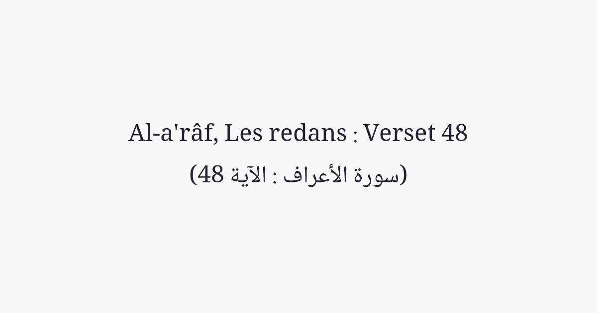 Et les gens d'al-A'râf, appelant certains hommes qu'ils reconnaîtront par leurs traits caractéristiques, diront: «Vous n'avez tiré aucun profit de tout ce que vous aviez amassé et de l'orgueil dont vous étiez enflés!