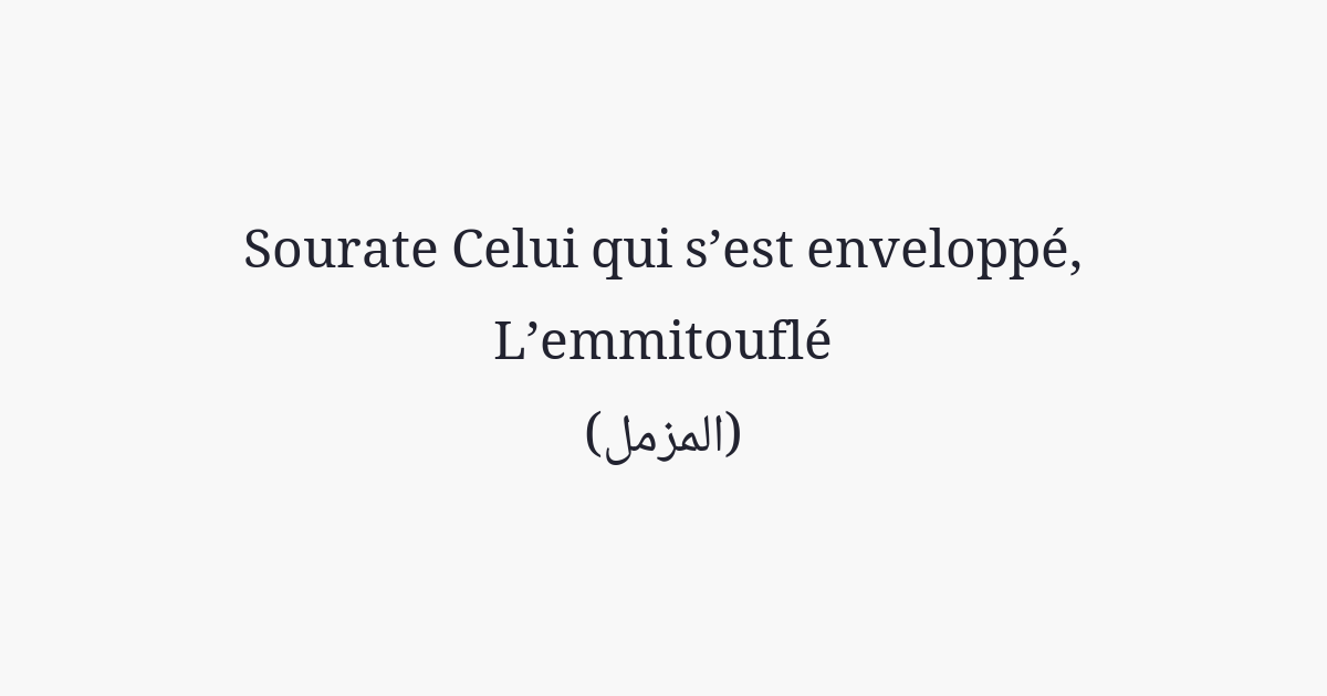 Ton Seigneur sait, certes, que tu (Muhammad) te tiens debout moins de deux tiers de la nuit, ou sa moitié, ou son tiers. De même qu'une partie de ceux qui sont avec toi. Allah détermine la nuit et le jour. Il sait que vous ne saurez jamais passer toute la nuit en prière. Il a usé envers vous avec indulgence. Récitez donc ce qui [vous] est possible du Coran. Il sait qu'il y aura parmi vous des malades, et d'autres qui voyageront sur la terre, en quête de la grâce d'Allah, et d'autres encore qui combattront dans le chemin d'Allah. Récite-en donc ce qui [vous] sera possible. Accomplissez la Salât, acquittez la Zakât, et faites à Allah un prêt sincère. Tout bien que vous vous préparez, vous le retrouverez auprès d'Allah, meilleur et plus grand en fait de récompense. Et implorez le pardon d'Allah. Car Allah est Pardonneur et Très Miséricordieux.