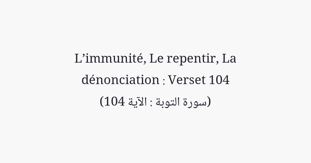 Ne savent-ils pas que c'est Allah qui accueille le repentir de Ses serviteurs, et qui reçoit les Sadaqât, et qu'Allah est L'Accueillant au repentir et le Miséricordieux.