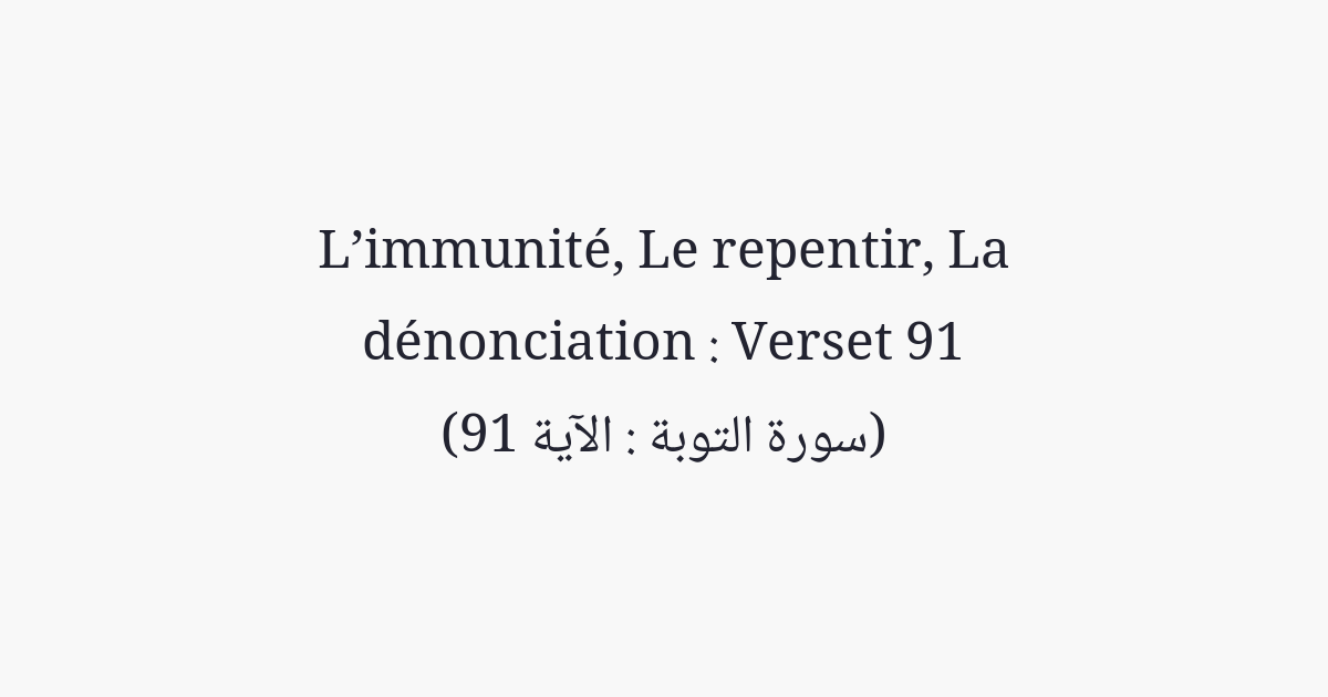 Nul grief sur les faibles, ni sur les malades, ni sur ceux qui ne trouvent pas de quoi dépenser (pour la cause d'Allah), s'ils sont sincères envers Allah et Son messager. Pas de reproche contre les bienfaiteurs. Allah est Pardonneur et Miséricordieux.