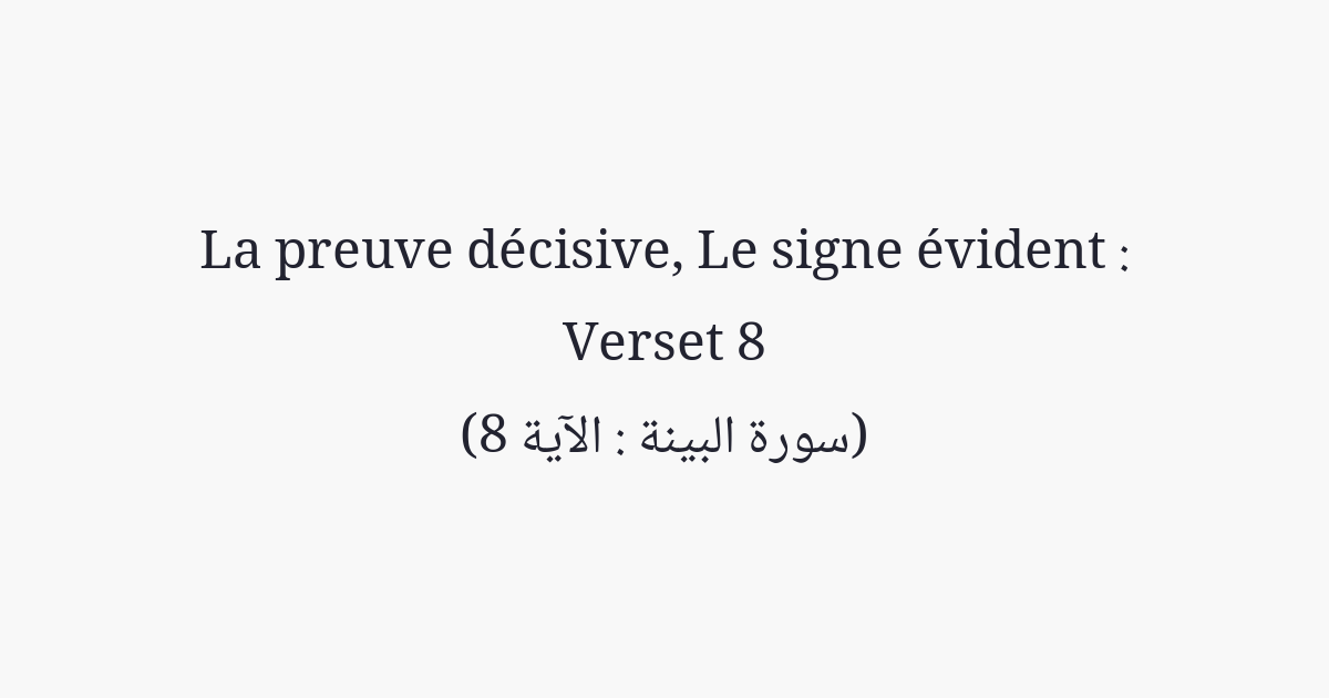 Leur récompense auprès d'Allah sera les Jardins de séjour, sous lesquels coulent les ruisseaux, pour y demeurer éternellement. Allah les agrée et ils L'agréent. Telle sera [la récompense] de celui qui craint son Seigneur.