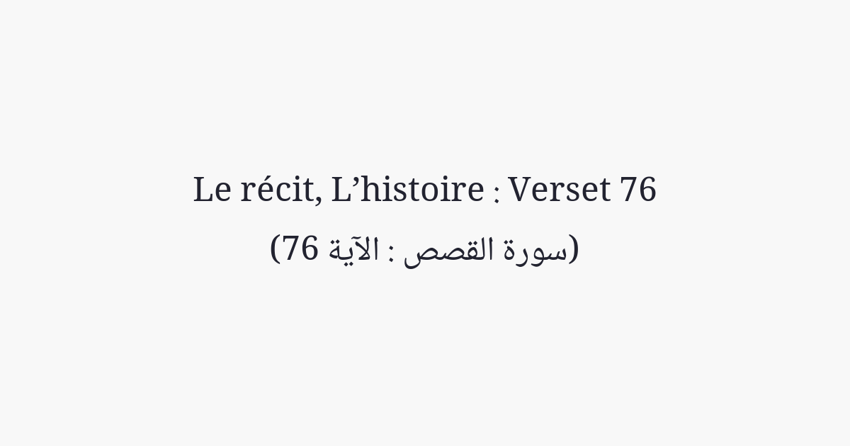 En vérité, Coré [Karoûn] était du peuple de Moïse mais il était empli de violence envers eux. Nous lui avions donné des trésors dont les clefs pesaient lourd à toute une bande de gens forts. Son peuple lui dit: «Ne te réjouis point. Car Allah n'aime pas les arrogants.