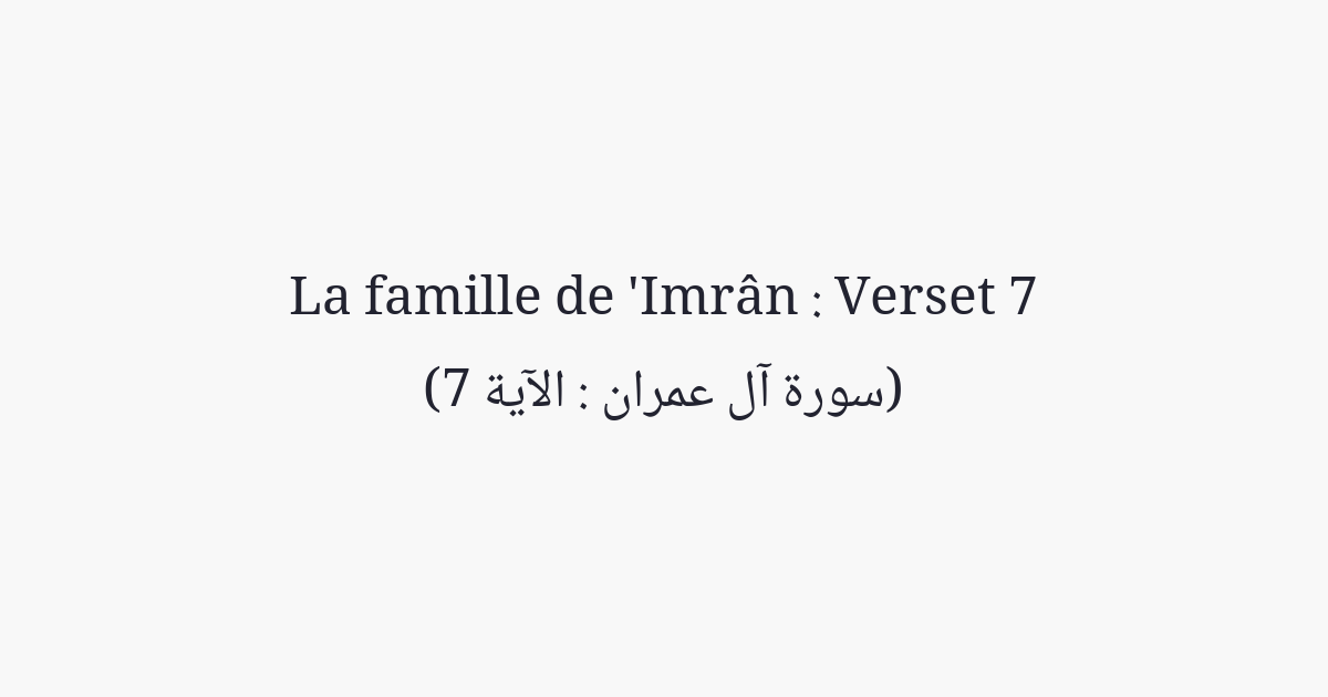 C'est Lui qui a fait descendre sur toi le Livre: il s'y trouve des versets sans équivoque, qui sont la base du Livre, et d'autres versets qui peuvent prêter à d'interprétations diverses. Les gens, donc, qui ont au cœur une inclination vers l'égarement, mettent l' accent sur les versets à équivoque cherchant la dissension en essayant de leur trouver une interprétation, alors que nul n'en connaît l'interprétation, à part Allah. Mais ceux qui sont bien enracinés dans la science disent: «Nous y croyons: tout est de la part de notre Seigneur!» Mais, seuls les doués d'intelligence s'en rappellent.