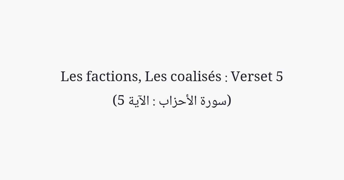 Appelez-les du nom de leurs pères: c'est plus équitable devant Allah. Mais si vous ne connaissez pas leurs pères, alors considérez-les comme vos frères en religion ou vos alliés. Nul blâme sur vous pour ce que vous faites par erreur, mais (vous serez blâmés pour) ce que vos cœurs font délibérément. Allah, cependant, est Pardonneur et Miséricordieux.