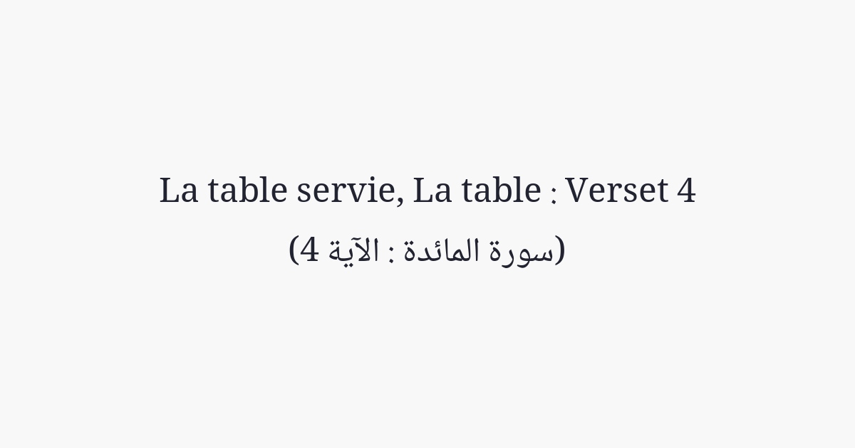 Ils t'interrogent sur ce qui leur est permis. Dis: «Vous sont permises les bonnes nourritures, ainsi que ce que capturent les carnassiers que vous avez dressés, en leur apprenant ce qu'Allah vous a appris. Mangez donc de ce qu'elles capturent pour vous et prononcez dessus le nom d'Allah. Et craignez Allah. Car Allah est, certes, prompt dans les comptes.