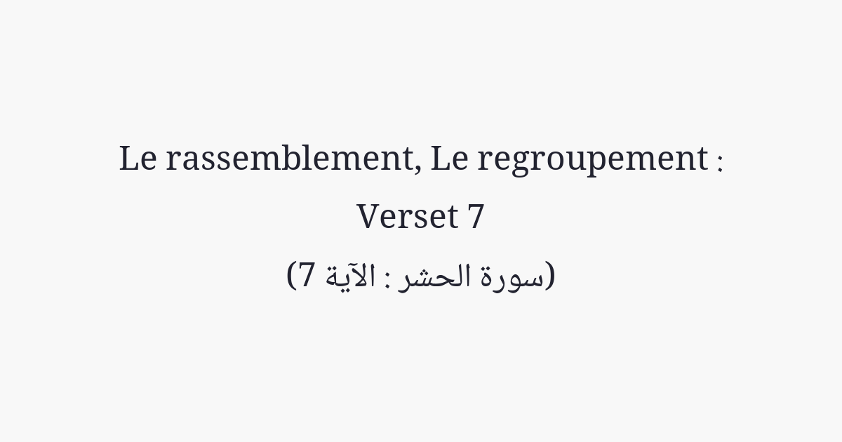 Le butin provenant [des biens] des habitants des cités, qu'Allah a accordé sans combat à Son Messager, appartient à Allah, au Messager, aux proches parents, aux orphelins, aux pauvres et au voyageur en détresse, afin que cela ne circule pas parmi les seuls riches d'entre vous. Prenez ce que le Messager vous donne; et ce qu'il vous interdit, abstenez-vous en; et craignez Allah car Allah est dur en punition.