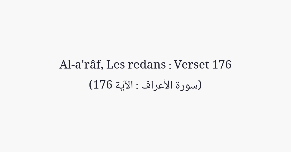 Et si Nous avions voulu, Nous l'aurions élevé par ces mêmes enseignements, mais il s'inclina vers la terre et suivit sa propre passion. Il est semblable à un chien qui halète si tu l'attaques, et qui halète aussi si tu le laisses. Tel est l'exemple des gens qui traitent de mensonges Nos signes. Eh bien, raconte le récit. Peut-être réfléchiront-ils!