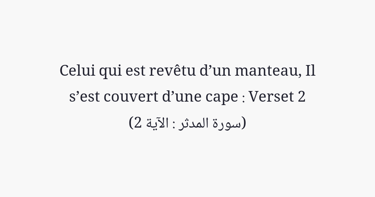 Ton Seigneur sait, certes, que tu (Muhammad) te tiens debout moins de deux tiers de la nuit, ou sa moitié, ou son tiers. De même qu'une partie de ceux qui sont avec toi. Allah détermine la nuit et le jour. Il sait que vous ne saurez jamais passer toute la nuit en prière. Il a usé envers vous avec indulgence. Récitez donc ce qui [vous] est possible du Coran. Il sait qu'il y aura parmi vous des malades, et d'autres qui voyageront sur la terre, en quête de la grâce d'Allah, et d'autres encore qui combattront dans le chemin d'Allah. Récite-en donc ce qui [vous] sera possible. Accomplissez la Salât, acquittez la Zakât, et faites à Allah un prêt sincère. Tout bien que vous vous préparez, vous le retrouverez auprès d'Allah, meilleur et plus grand en fait de récompense. Et implorez le pardon d'Allah. Car Allah est Pardonneur et Très Miséricordieux.