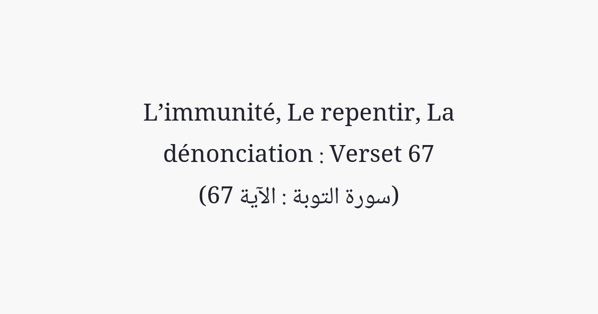 Les hypocrites, hommes et femmes, appartiennent les uns aux autres. Ils commandent le blâmable, interdisent le convenable, et replient leurs mains (d'avarice). Ils ont oublié Allah et Il les a alors oubliés. En vérité, les hypocrites sont les pervers.
